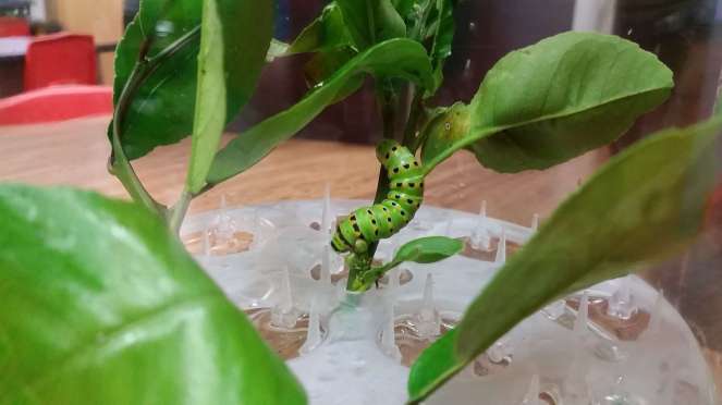 One morning, I found this beautiful, shiny green caterpillar nestled in my little lemon tree. I was headed to work and thought… My students will love to watch this little guy (or girl)! I quickly gathered a clear container, clipped the branch that was now his home, and headed to school (all the while imagining the smiles on my students’ faces).